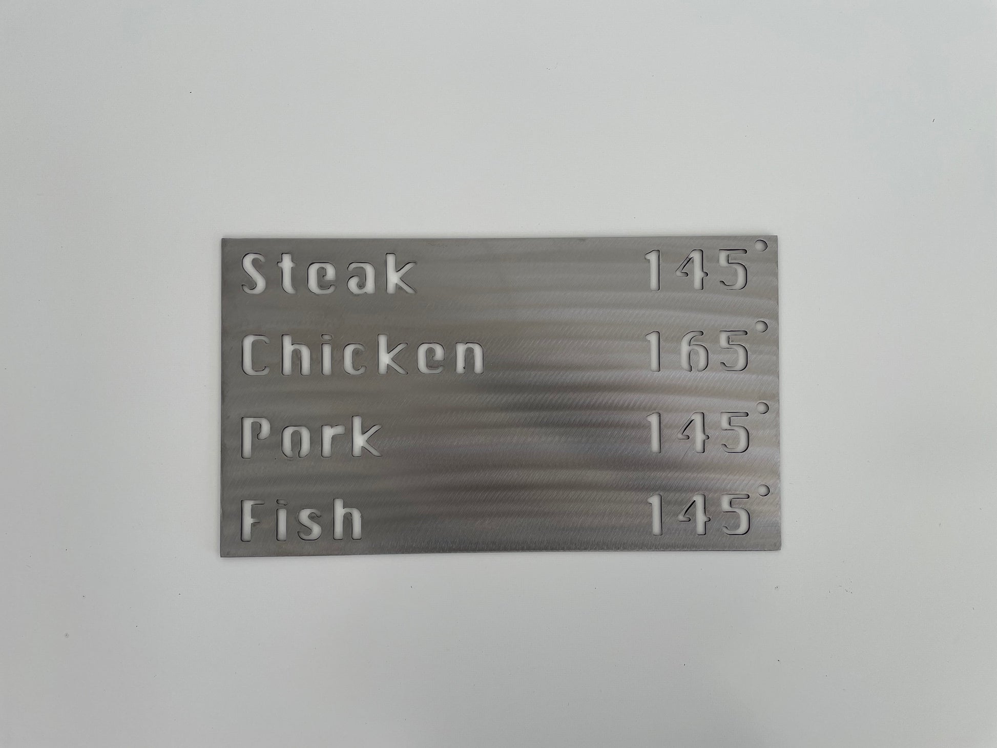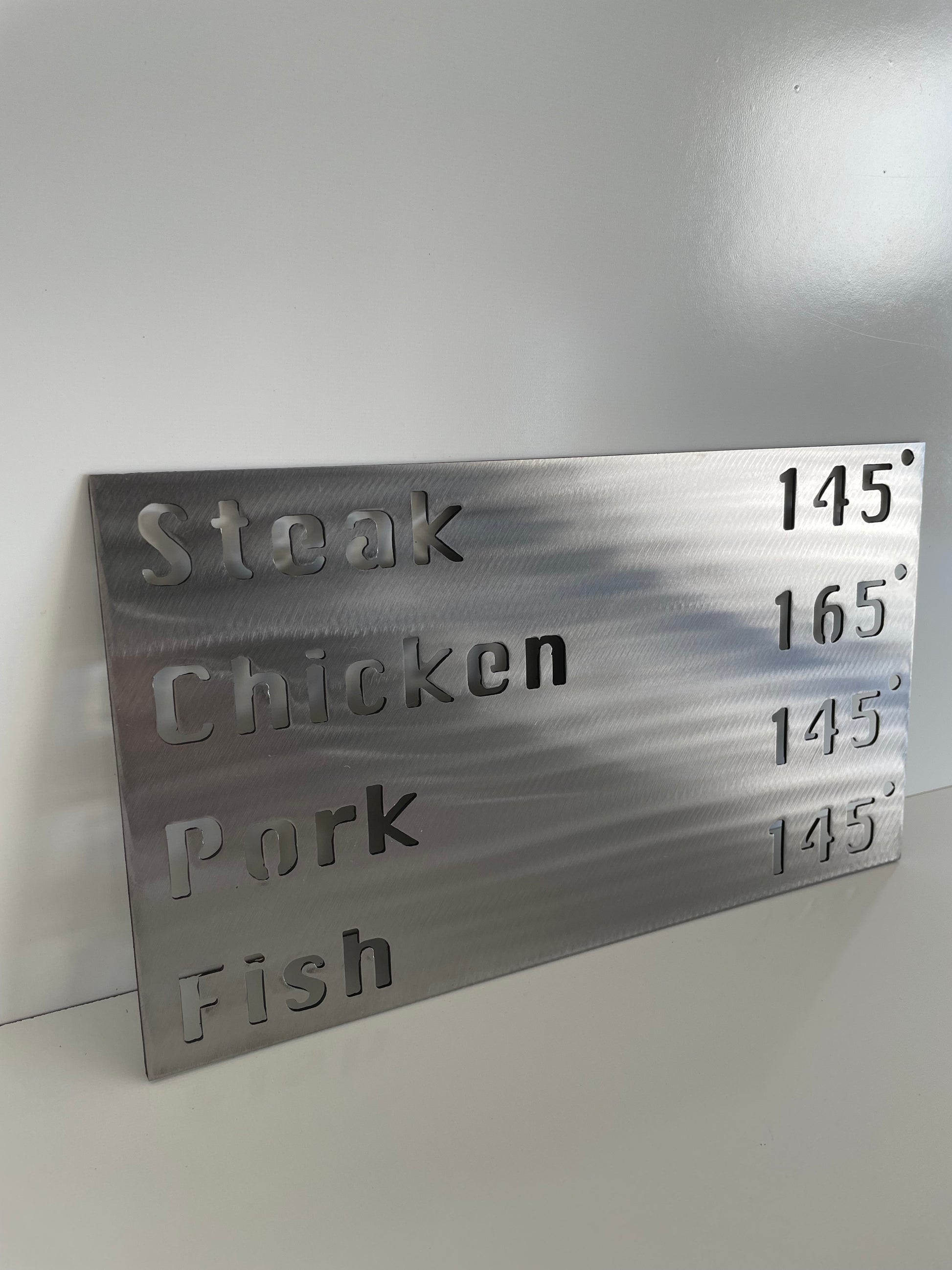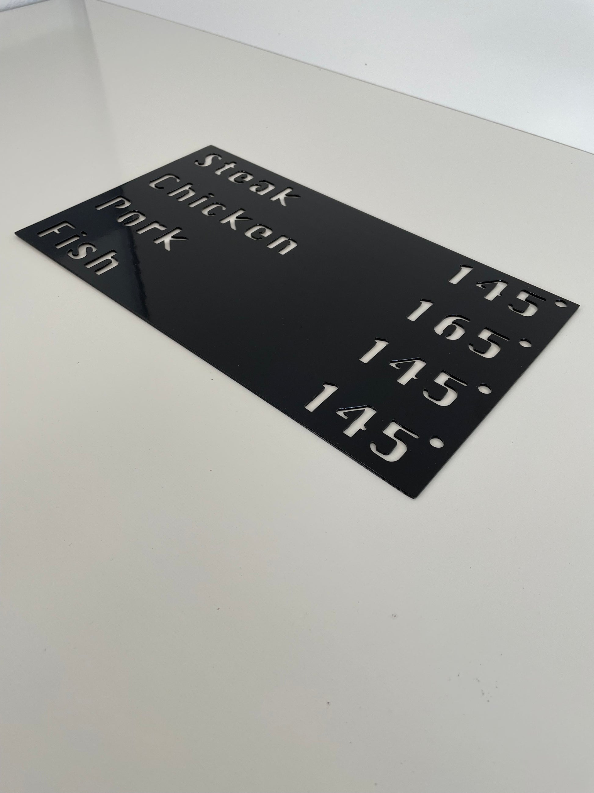 Never get the temperature of your meat on your grill wrong again with this meat temperature sign. The sign comes is polished metal or black to match whatever type of grill you have. Attached with the supplied double sided tape or if you want to place it where heat will be a problem use the supplied magnets.