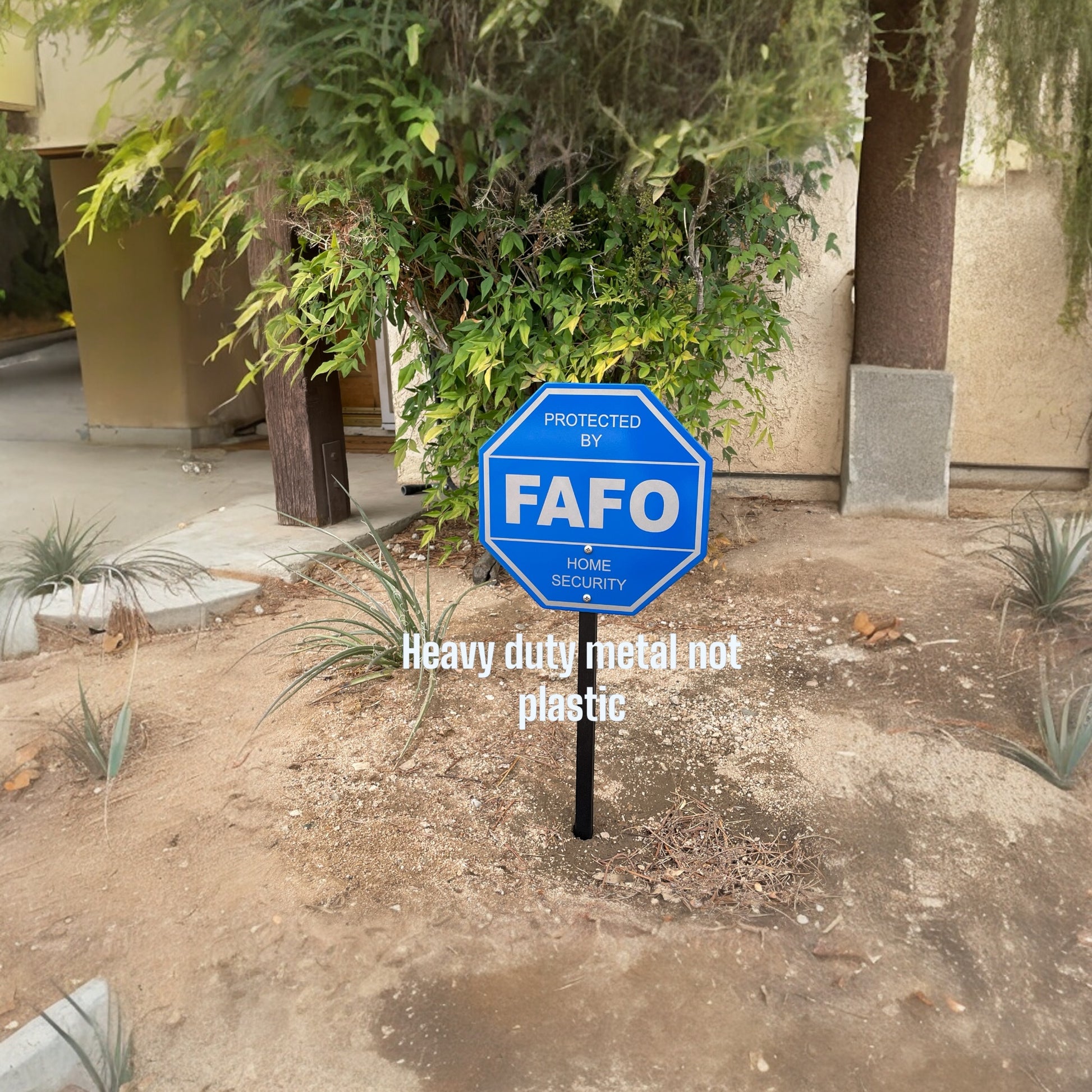 FAFO Home Security sign (Fuck Around and Find Out). Unlike others this sign is made of metal and can withstand being outdoors. The 10"x10" sign is laser engraved showing the brightness of the metal. After laser engraving a heavy clear coat is added. The stake is 16" long to allow you plenty of room to drive it into the ground. The stake is also removable, if your ground is hard you can hammer the stake in, then attached the sign.