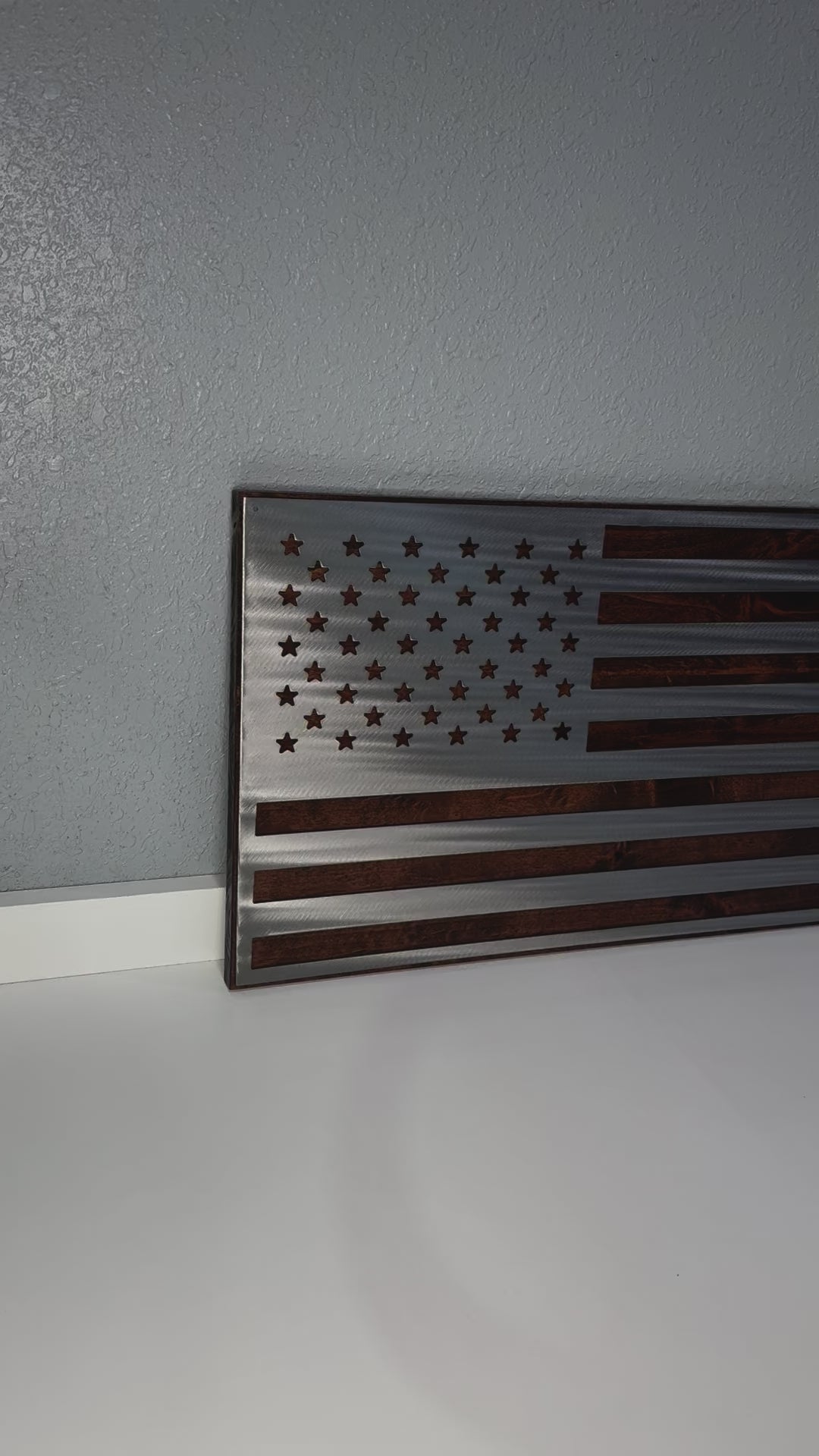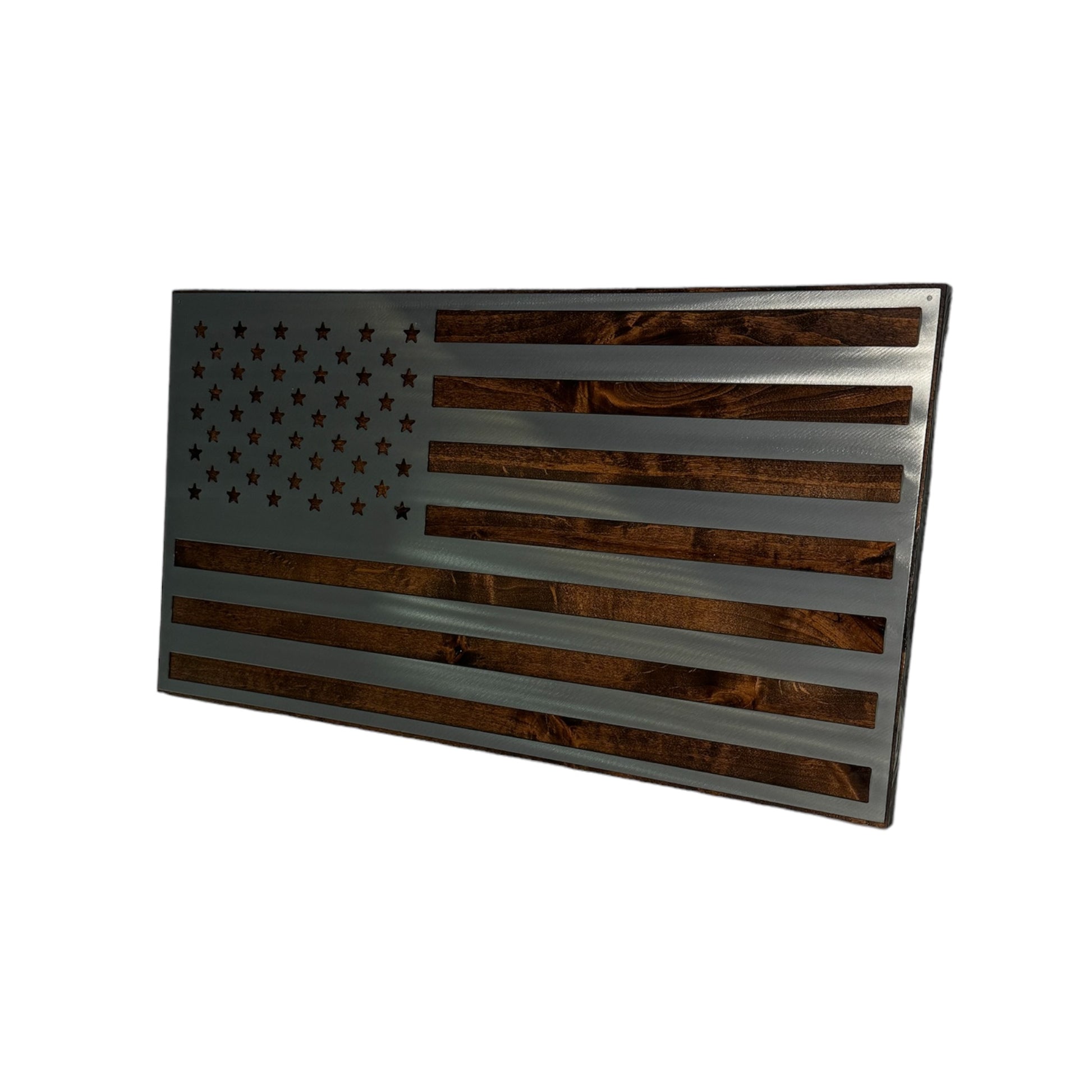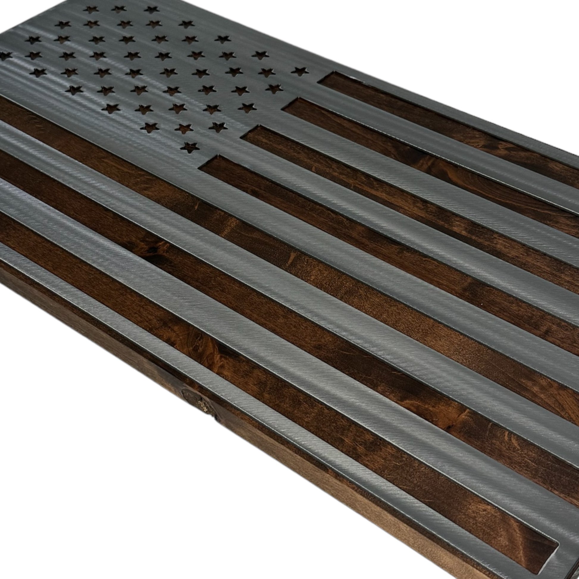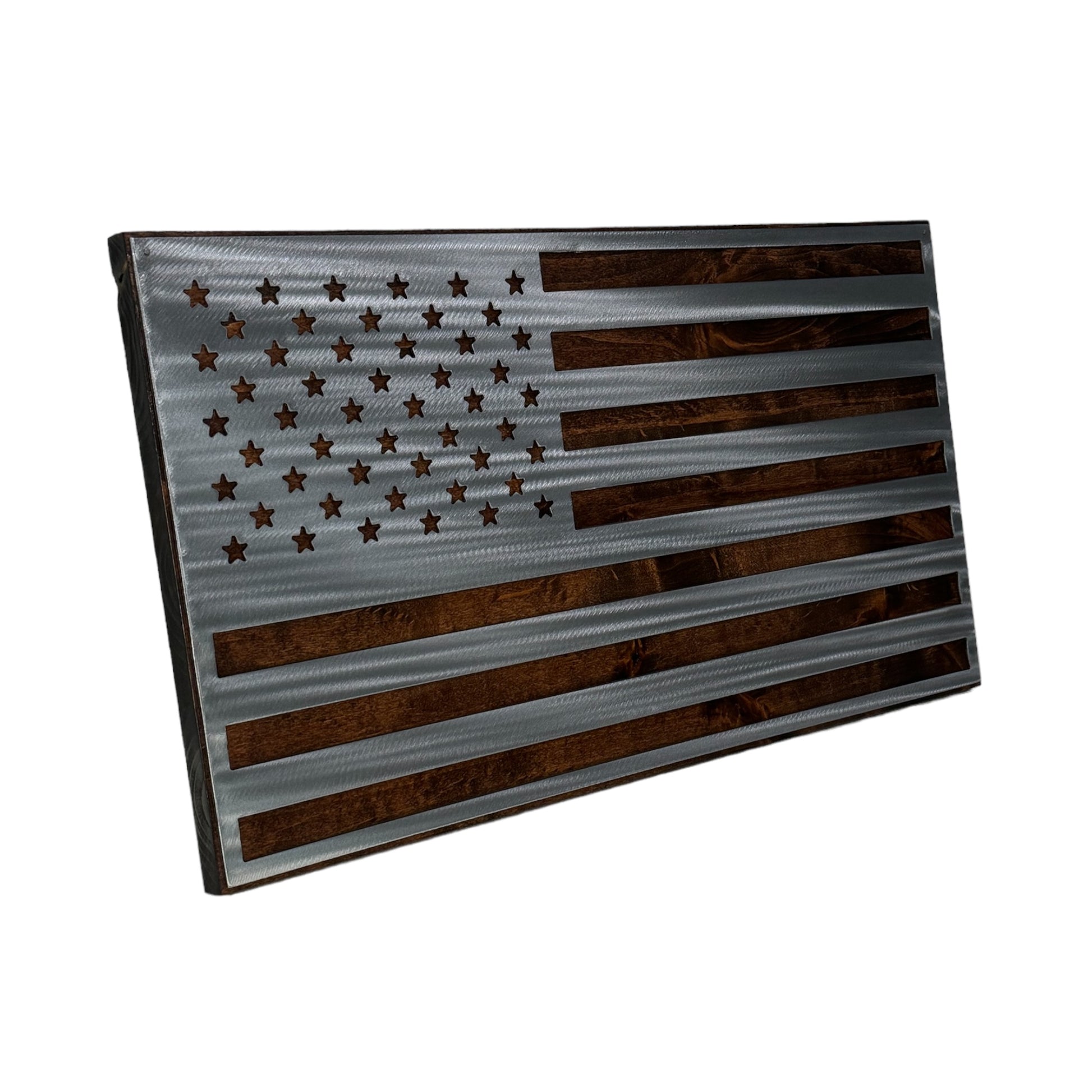 This is the classic metal American Flag, but it is mounted on wood. The wood is 3/4" thick, stained with a clear topcoat. The American flag is cut out of 16 gauge steel, about the thickness of a penny. It was cut out with a computer-controlled machine, so the lines are very precise. A hanger is attached to the back to accept screws or nails for hanging.