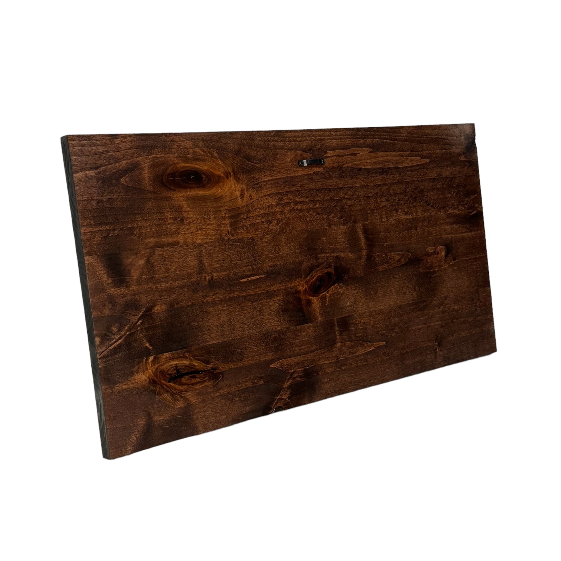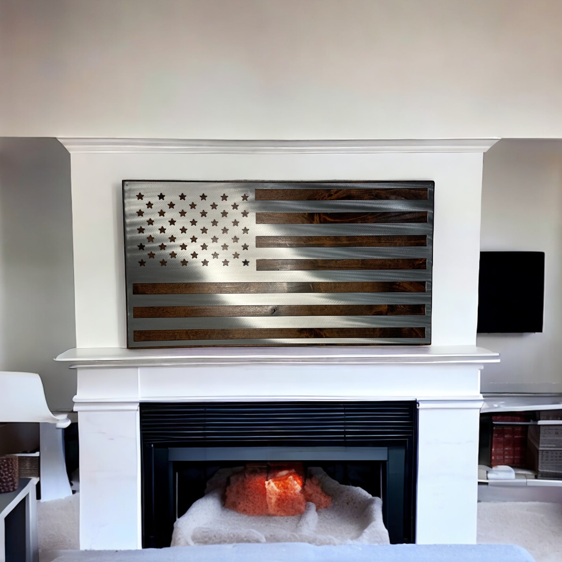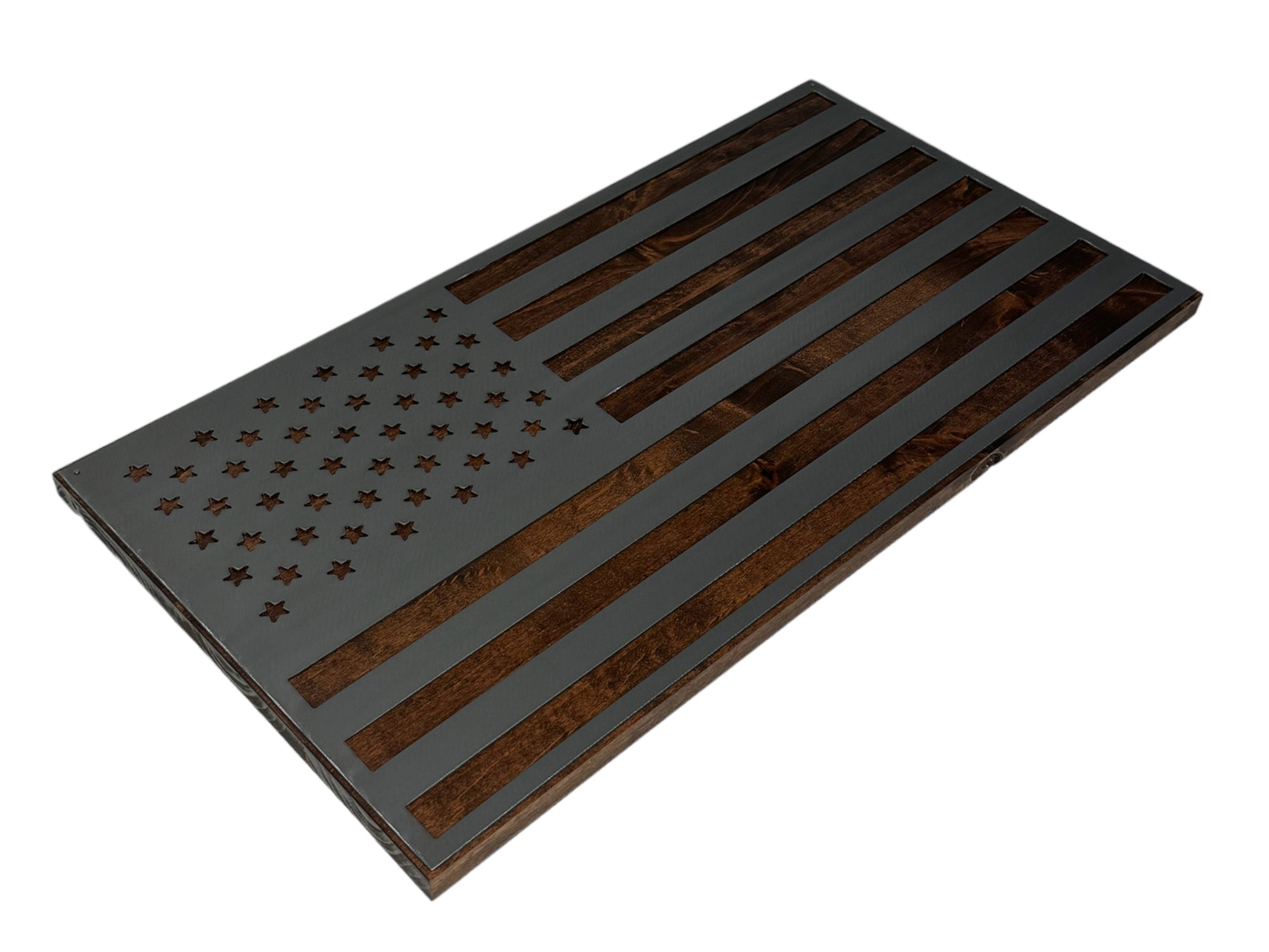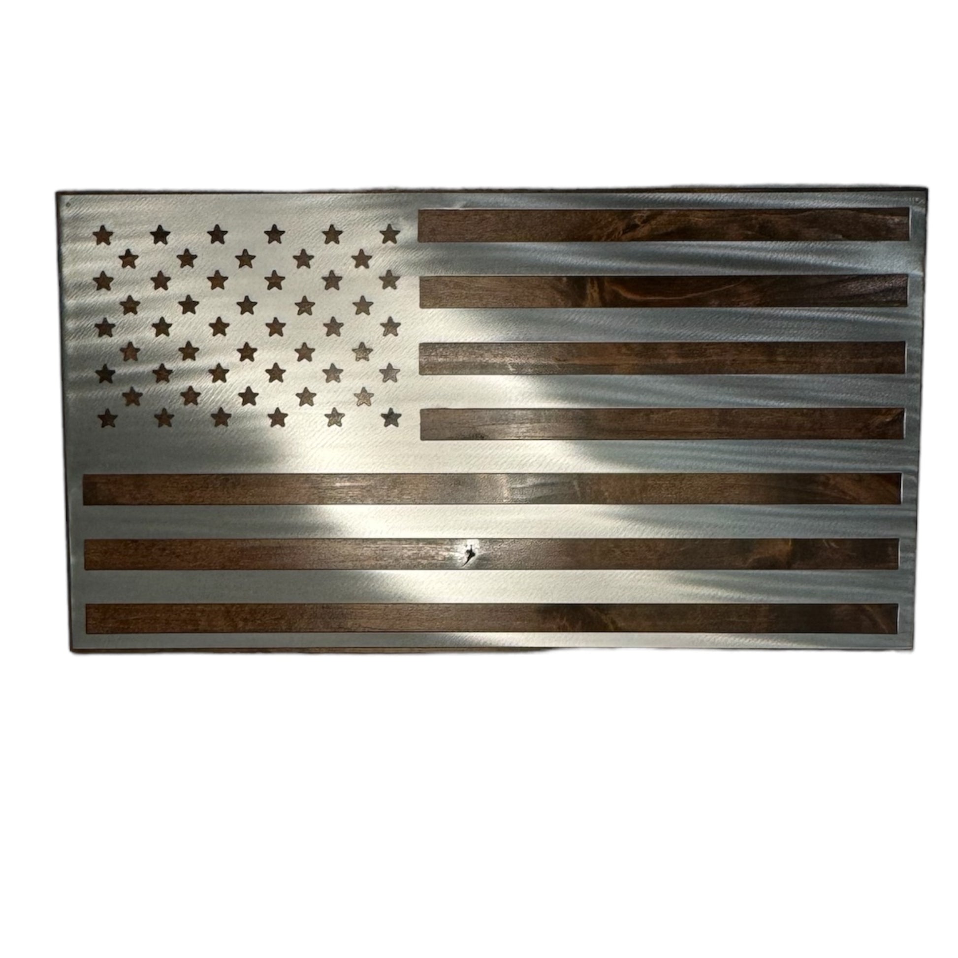 This is the classic metal American Flag, but it is mounted on wood. The wood is 3/4" thick, stained with a clear topcoat. The American flag is cut out of 16 gauge steel, about the thickness of a penny. It was cut out with a computer-controlled machine, so the lines are very precise. A hanger is attached to the back to accept screws or nails for hanging.